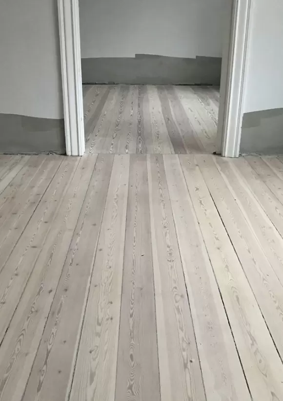 råt udgangspunkt for en ny behandling. Herefter afslibes gulvet, så det bliver